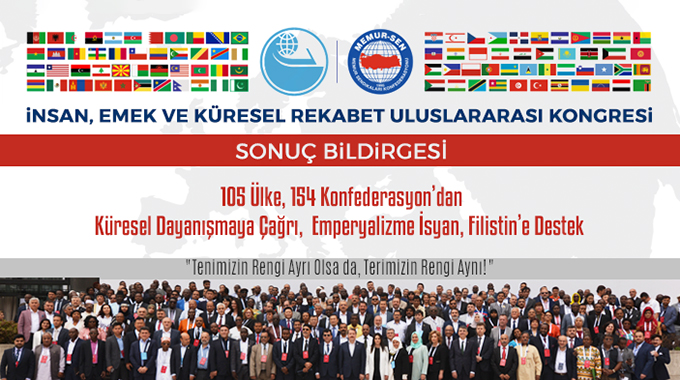 "İnsan, Emek ve Küresel Rekabet Uluslararası Kongresi"nin sonuç bildirgesi açıklandı. Bildirgede, Filistin halkıyla dayanışma içinde olunduğu vurgulandı, ABD'nin büyükelçiliğini Kudüs'e taşıma kararı kınandı, küresel eşitsizliklere karşı mücadele, sosyal diyalogun artırılması ve emek temsilcilerinin birleşmesi çağrısında bulunuldu.