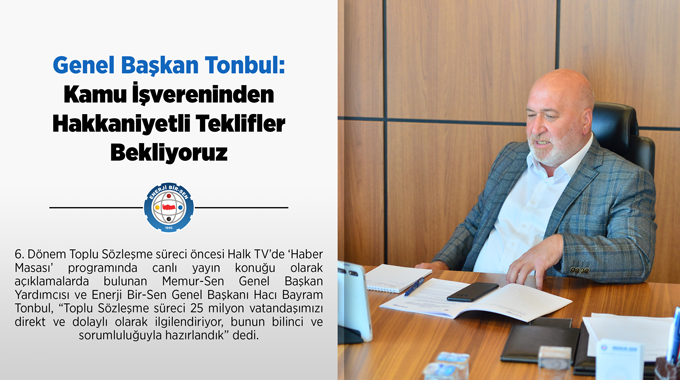 6. Dönem Toplu Sözleşme süreci öncesi Halk TV’de ‘Haber Masası’ programında canlı yayın konuğu olarak açıklamalarda bulunan Memur-Sen Genel Başkan Yardımcısı ve Enerji Bir-Sen Genel Başkanı Hacı Bayram Tonbul, “Toplu Sözleşme süreci 25 milyon vatandaşımızı direkt ve dolaylı olarak ilgilendiriyor, bunun bilinci ve sorumluluğuyla hazırlandık” dedi.
