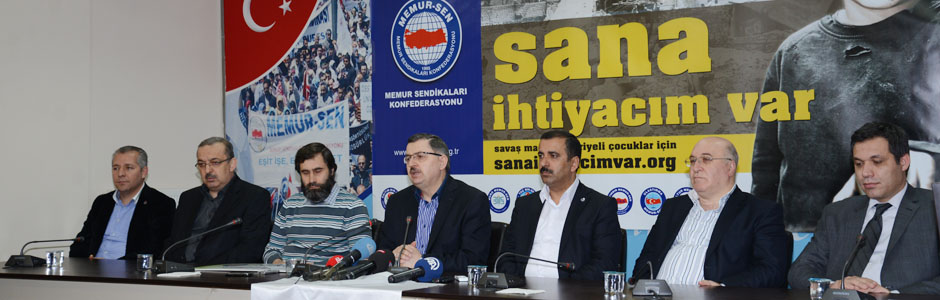 Suriye halkı için başlatılan “Sana İhtiyacım Var” kampanyası kapsamında Memur-Sen Genel Merkezinde Basın toplantısı düzenlendi. Toplantıya Memur-Sen Konfederasyonu ile bağlı sendika Genel Başkanları ve İHH yöneticileri katıldı. Toplantı sonunda Memur-Sen Genel Başkanı Ahmet Gündoğdu, 600.000 TL'lik çeki İHH Ankara Temsilcisi Mustafa Sinan'a teslim etti.